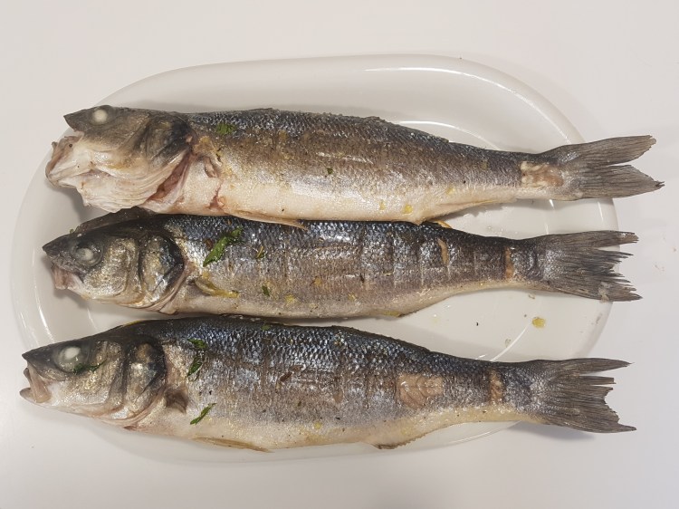 - Salpimentar las lubinas y echar un chorrito de aceite tanto por dentro como por fuera.